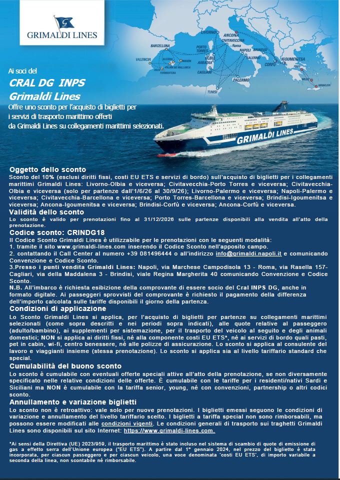 Sconto del 10% sull’acquisto dei collegamenti marittimi Grimaldi Lines per Spagna, Grecia, Tunisia, Sicilia e Sardegna